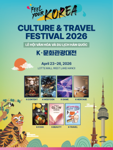 Tổng cục Du lịch Hàn Quốc tại Việt Nam và Trung tâm Văn hóa Hàn Quốc tại Việt Nam phối hợp tổ chức “Lễ hội Văn hóa và Du lịch Hàn Quốc 2026”- đây là sự kiện kết hợp quảng bá văn hóa và du lịch Hàn Quốc tại trung tâm thương mại Lotte Mall Tây Hồ, Hà Nội từ ngày 23 đến 26 tháng 4. Trong bối cảnh xu hướng khách du lịch Việt Nam đến Hàn Quốc đang trên đà phát triển nhanh chóng, sự kiện nhằm thúc đẩy thu hút khách du lịch Việt Nam đến Hàn Quốc, đồng thời củng cố giao lưu văn hóa và du lịch giữa hai nước.